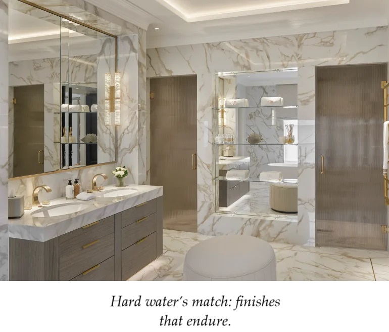 The key is to choose the finish not in isolation, but as part of the full design language of the bathroom.