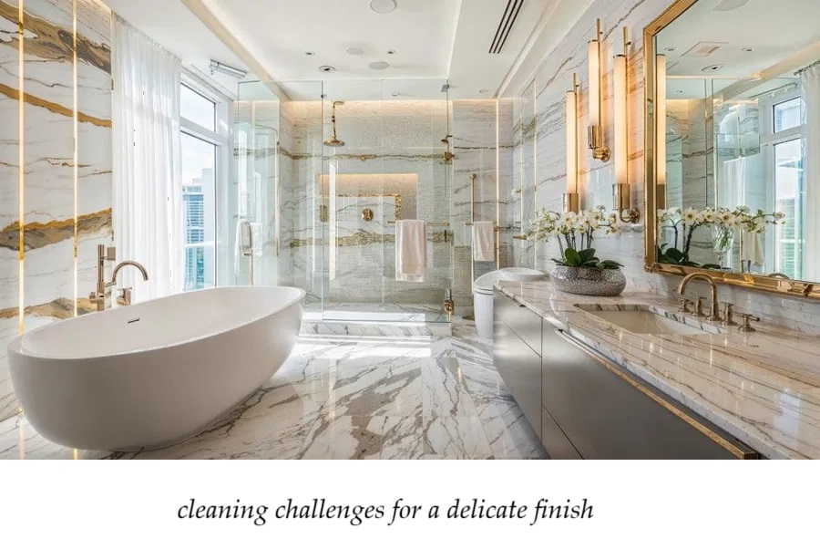 It benefits from mild cleaning methods and can be scratched or dulled by abrasive tools or harsh chemicals.